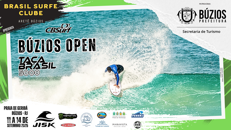 Brasil Surfe Clube Aretê Búzios apresenta CBSurf Taça Brasil Búzios Open é mais uma realização da Confederação Brasileira de Surf, em parceria com a Federação de Surf do Estado do Rio de Janeiro (FESERJ) e Associação de Surf de Búzios (ASB). A quinta etapa da Taça Brasil 2025 vai acontecer com patrocínio da Prefeitura de Armação dos Búzios através da Secretaria de Turismo, apresentação do Brasil Surfe Clube Aretê Búzios e apoio do Hotel Le Relais La Borie, JISK, Monster Energy, Fu-Wax, Pousada Marbella, Pousada dos Gravatás, Pousada e Restaurante Praia da Tartaruga, Maravista Hotel & Spa e transmissão ao vivo no CBSurf.org.br pelo canal CBSurfPLAY no YouTube.