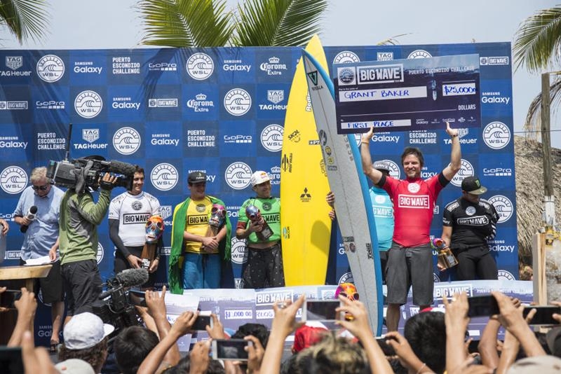 Aos 43 anos, o sul-africano Grant Baker dominou as bombas de Puerto Escondido, no México, e sagrou-se campeão da primeira etapa do Circuito Mundial de Ondas Grandes de 2016. Com direito a um 10 unânime num tubaço, o surfista de Durban somou 27.50 pontos (7.50 + 10.00 x 2) para vencer o americano Greg Long (25.03), os brasileiros Pedro Calado (24.77) e Carlos Burle (16.87), o também americano Will Skudin (12.97) e Makua Rothman (7.66), do Havaí. O filho de Fast Eddie, machucou o peito e as costelas ao ser atingido pela prancha numa vaca.