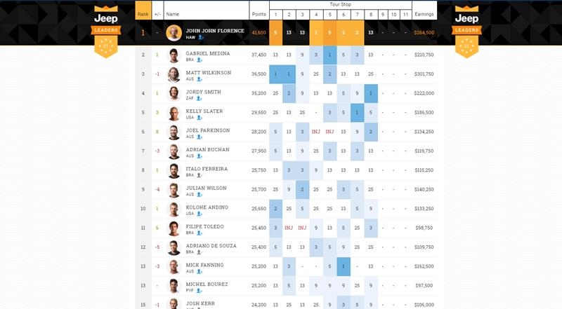 TOP-22 DO JEEP WSL RANKING - após a oitava etapa em Trestles: