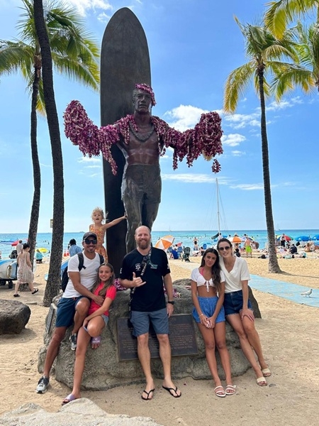 Geraldo Augusto e Luiza Guedes com as filhas Giovana e Isabela, com Phil e Coral Rajzman, na estátua de Duke kahanamoku, em Honolulu/Oahu (Crédito: Divulgação)