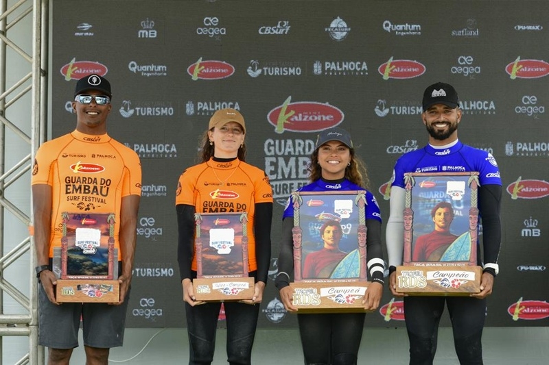 03/Nov/2025 - Assessoria de Imprensa CBSurf - Palhoça - Santa Catarina - BrasilGUARDA DO EMBAÚ, Palhoça / SC (Domingo, 2 de novembro) - O Mini Kalzone Guarda do Embaú Surf Festival apresentado pela Secretaria de Turismo de Palhoça terminou com festa da Tainá Hinckel em casa e do Michael Rodrigues na manhã do domingo na Reserva Mundial de Surf. Os dois troféus das vitórias que a Federação Catarinense de Surf homenageou o ídolo local, Ricardo dos Santos, que faleceu 10 anos atrás, ficaram em Santa Catarina. Tainá ganhou uma final catarinense com Isabelle Nalu e a decisão masculina foi entre dois cearenses, com o Michael há muitos anos morando em Florianópolis, derrotando Cauã Costa, que reside no Rio de Janeiro. Já o título brasileiro feminino da Taça Brasil 2025, ficou com a também cearense Juliana dos Santos, que recebeu o troféu de campeã junto com o catarinense Yuri Gabryel, campeão de apenas 16 anos.