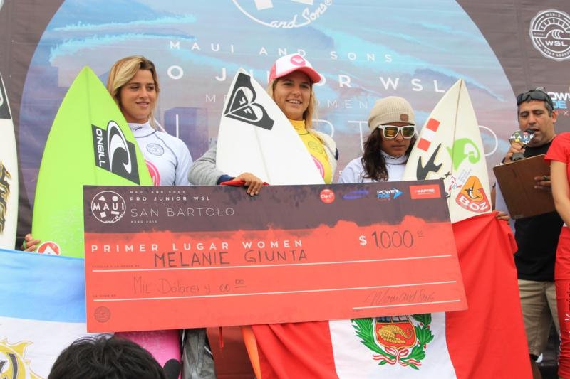 "Estou muito feliz pela vitória, pois com este resultado subi para o segundo lugar no ranking e duas peruanas se classificaram para o Mundial Pro Junior da WSL em janeiro", disse Melanie Giunta. "A semifinal foi uma das baterias mais difíceis que eu tive nesse torneio e a final com a Miluska (Tello) foi muito engraçada porque somos grandes amigas. As condições do mar mudaram muito, ficou difícil achar ondas boas, mas consegui vencer e nós duas vamos treinar bastante para representar bem o Peru lá na Austrália".