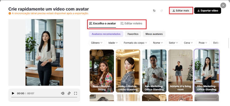 Passo 2: Selecione um avatar e personalize o roteiro