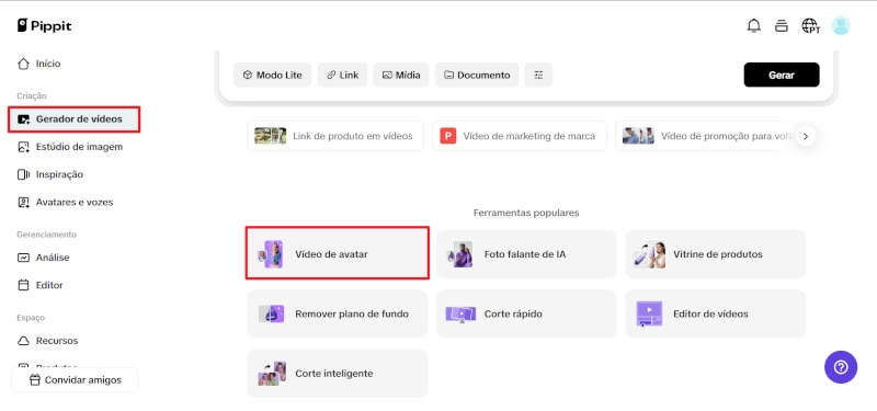 Entre no Pippit e clique em Gerador de Vídeos no menu lateral. Em Ferramentas Populares, selecione Vídeo de Avatar para escolher ou criar avatares de IA para usar em seus vídeos.