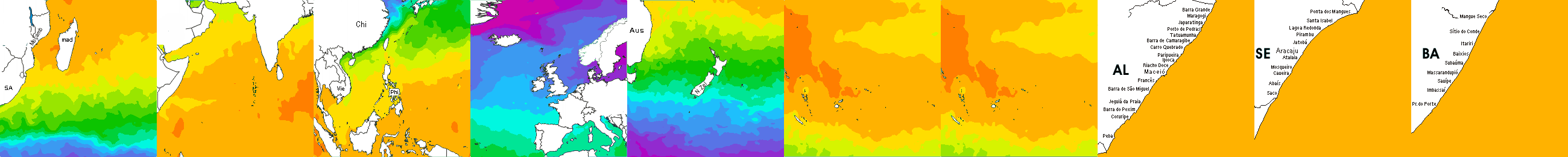 * Temperatura da superfície do mar perto da costa. Diferenças podem ocorrer dentro das baías e perto da foz dos rios, devido à influência das águas costeiras.