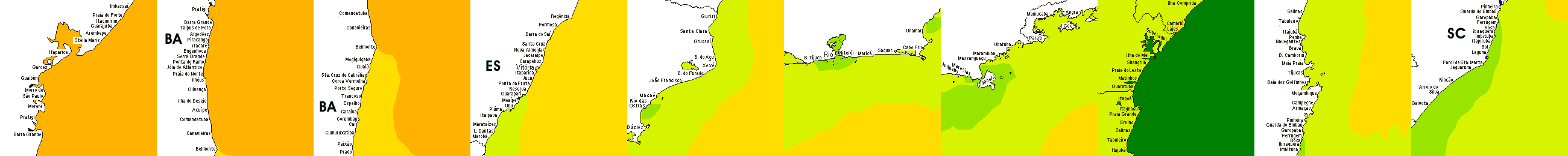 * Temperatura da superfície do mar perto da costa. Diferenças podem ocorrer dentro das baías e perto da foz dos rios, devido à influência das águas costeiras.