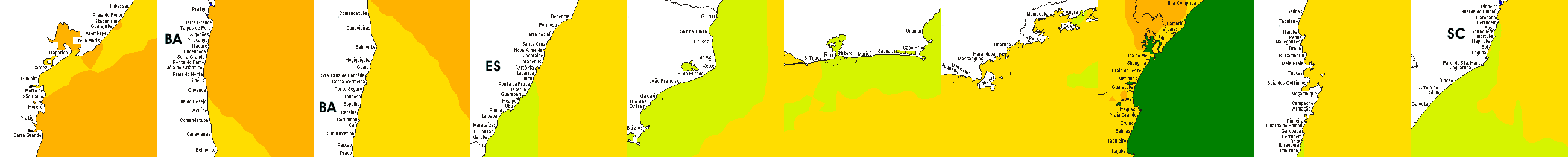 * Temperatura da superfície do mar perto da costa. Diferenças podem ocorrer dentro das baías e perto da foz dos rios, devido à influência das águas costeiras.