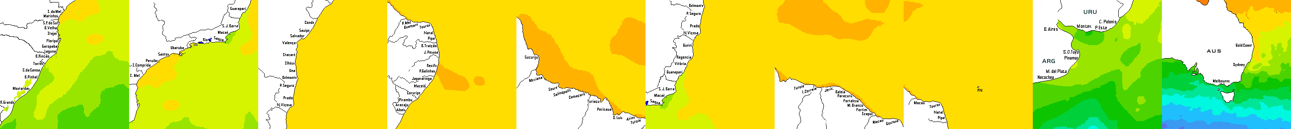 * Temperatura da superfície do mar perto da costa. Diferenças podem ocorrer dentro das baías e perto da foz dos rios, devido à influência das águas costeiras.