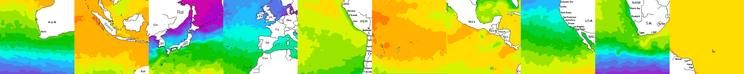 * Temperatura da superfície do mar perto da costa. Diferenças podem ocorrer dentro das baías e perto da foz dos rios, devido à influência das águas costeiras.