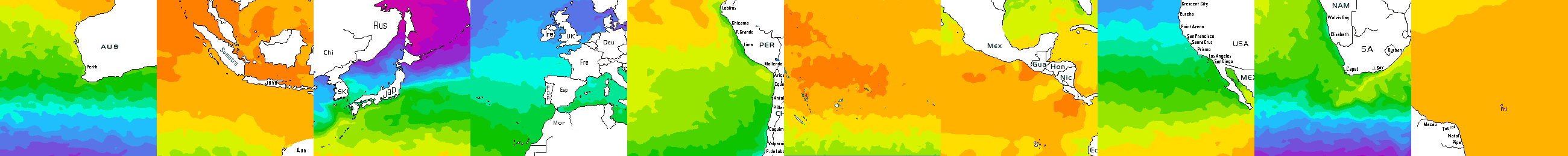 * Temperatura da superfície do mar perto da costa. Diferenças podem ocorrer dentro das baías e perto da foz dos rios, devido à influência das águas costeiras.