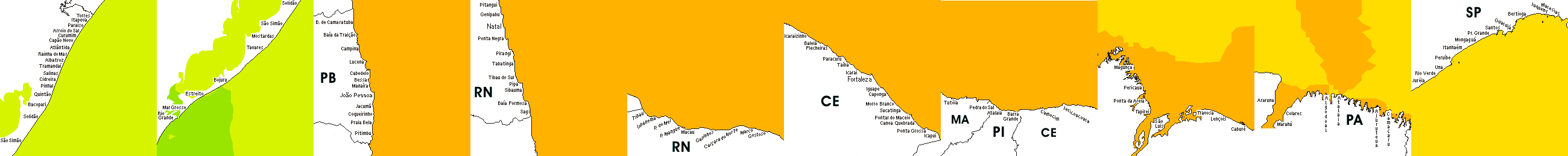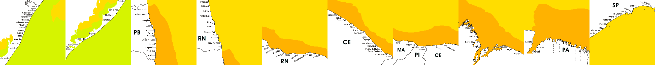 * Temperatura da superfície do mar perto da costa. Diferenças podem ocorrer dentro das baías e perto da foz dos rios, devido à influência das águas costeiras.