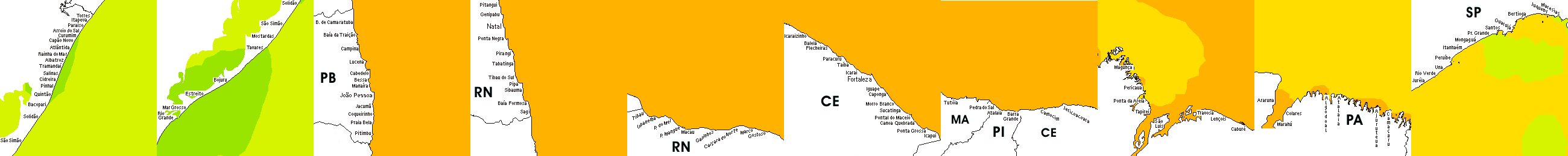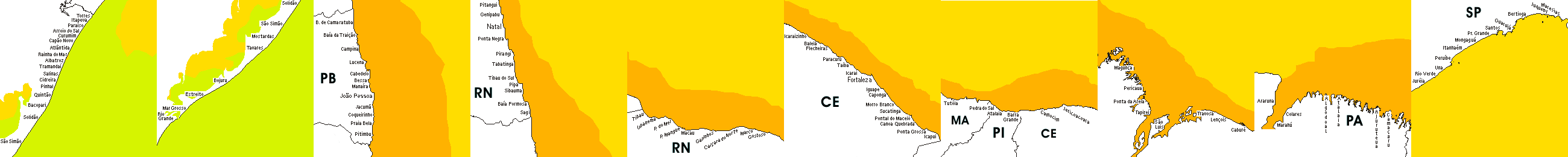 * Temperatura da superfície do mar perto da costa. Diferenças podem ocorrer dentro das baías e perto da foz dos rios, devido à influência das águas costeiras.
