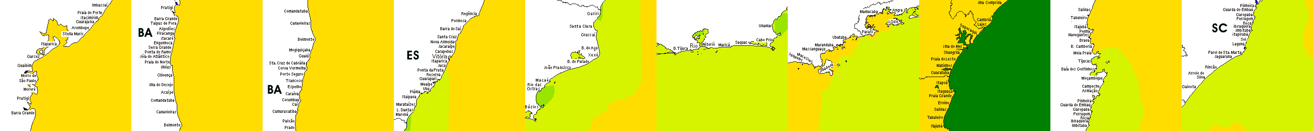 * Temperatura da superfície do mar perto da costa. Diferenças podem ocorrer dentro das baías e perto da foz dos rios, devido à influência das águas costeiras.