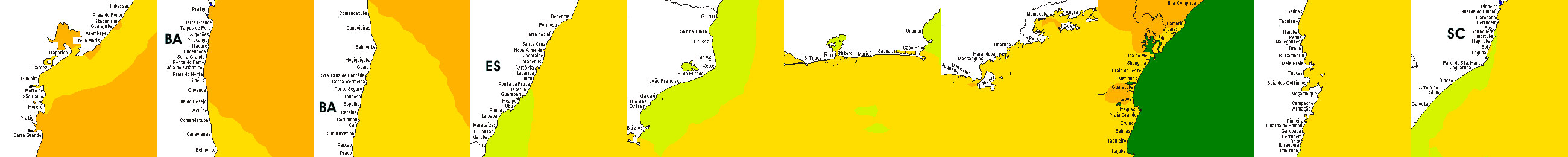 * Temperatura da superfície do mar perto da costa. Diferenças podem ocorrer dentro das baías e perto da foz dos rios, devido à influência das águas costeiras.