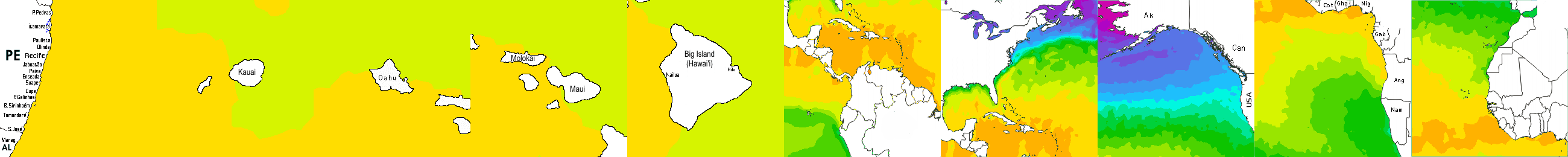 * Temperatura da superfície do mar perto da costa. Diferenças podem ocorrer dentro das baías e perto da foz dos rios, devido à influência das águas costeiras.