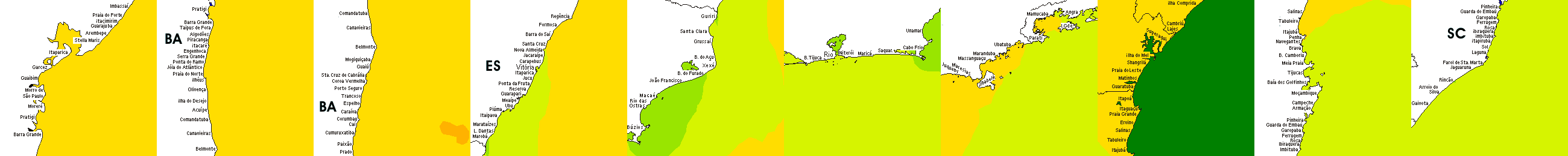 * Temperatura da superfície do mar perto da costa. Diferenças podem ocorrer dentro das baías e perto da foz dos rios, devido à influência das águas costeiras.