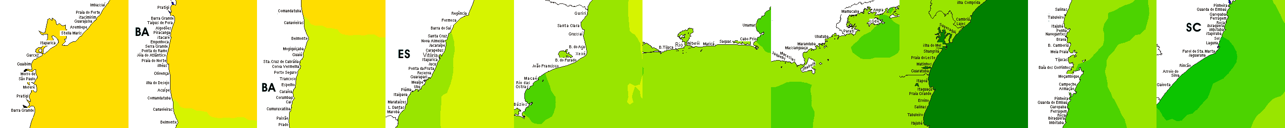 * Temperatura da superfície do mar perto da costa. Diferenças podem ocorrer dentro das baías e perto da foz dos rios, devido à influência das águas costeiras.