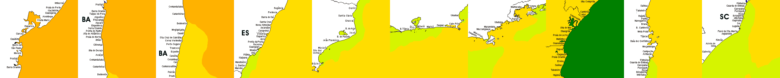 * Temperatura da superfície do mar perto da costa. Diferenças podem ocorrer dentro das baías e perto da foz dos rios, devido à influência das águas costeiras.