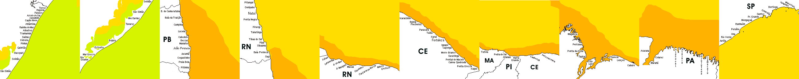 * Temperatura da superfície do mar perto da costa. Diferenças podem ocorrer dentro das baías e perto da foz dos rios, devido à influência das águas costeiras.