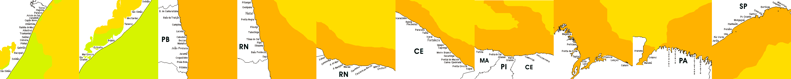 * Temperatura da superfície do mar perto da costa. Diferenças podem ocorrer dentro das baías e perto da foz dos rios, devido à influência das águas costeiras.