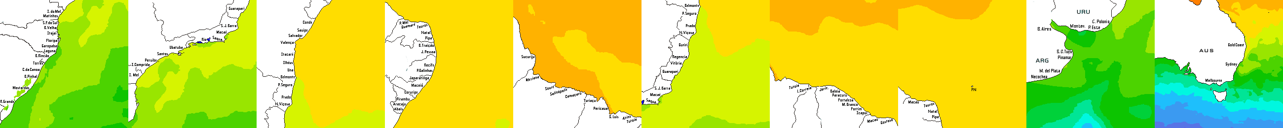 * Temperatura da superfície do mar perto da costa. Diferenças podem ocorrer dentro das baías e perto da foz dos rios, devido à influência das águas costeiras.