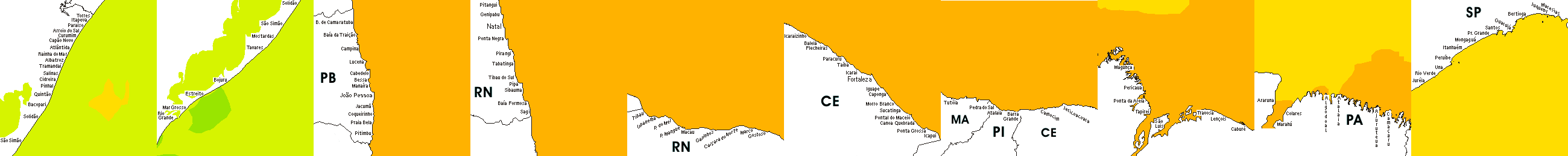 * Temperatura da superfície do mar perto da costa. Diferenças podem ocorrer dentro das baías e perto da foz dos rios, devido à influência das águas costeiras.