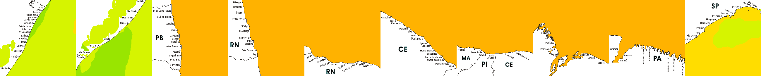 * Temperatura da superfície do mar perto da costa. Diferenças podem ocorrer dentro das baías e perto da foz dos rios, devido à influência das águas costeiras.