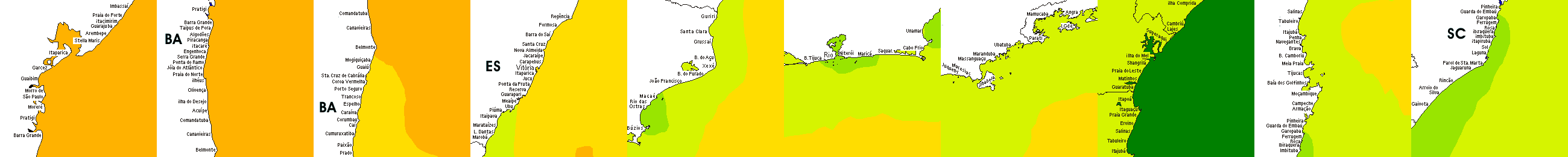 * Temperatura da superfície do mar perto da costa. Diferenças podem ocorrer dentro das baías e perto da foz dos rios, devido à influência das águas costeiras.