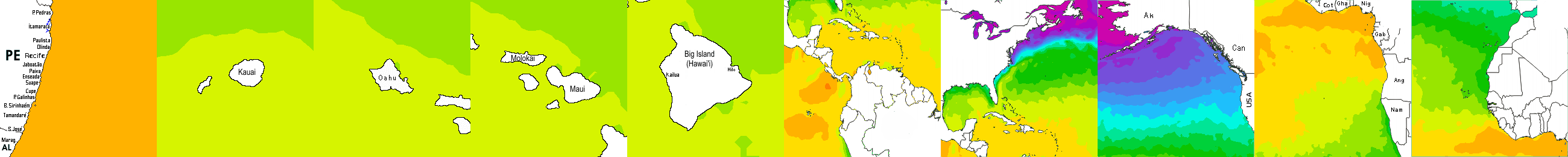 * Temperatura da superfície do mar perto da costa. Diferenças podem ocorrer dentro das baías e perto da foz dos rios, devido à influência das águas costeiras.