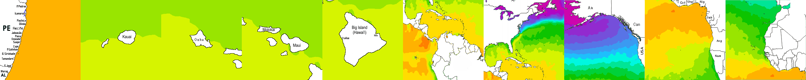 * Temperatura da superfície do mar perto da costa. Diferenças podem ocorrer dentro das baías e perto da foz dos rios, devido à influência das águas costeiras.