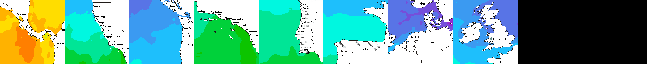 * Temperatura da superfície do mar perto da costa. Diferenças podem ocorrer dentro das baías e perto da foz dos rios, devido à influência das águas costeiras.