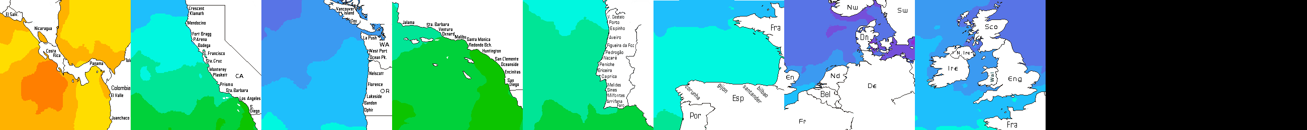 * Temperatura da superfície do mar perto da costa. Diferenças podem ocorrer dentro das baías e perto da foz dos rios, devido à influência das águas costeiras.