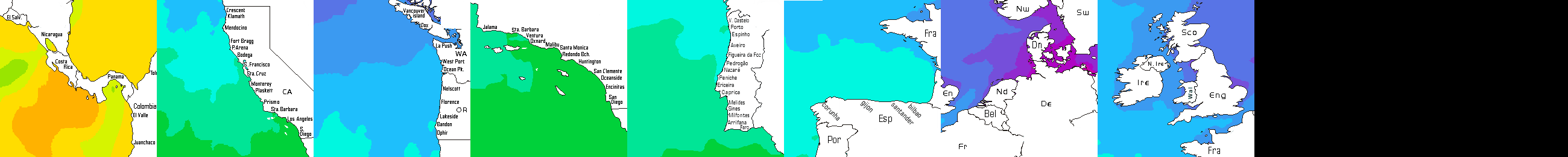* Temperatura da superfície do mar perto da costa. Diferenças podem ocorrer dentro das baías e perto da foz dos rios, devido à influência das águas costeiras.