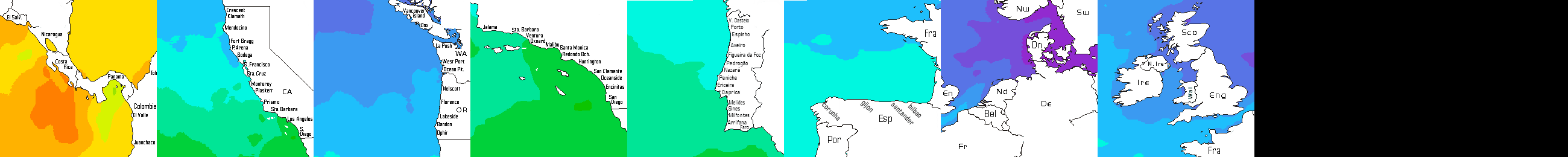 * Temperatura da superfície do mar perto da costa. Diferenças podem ocorrer dentro das baías e perto da foz dos rios, devido à influência das águas costeiras.