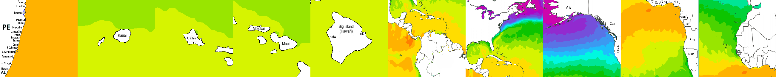 * Temperatura da superfície do mar perto da costa. Diferenças podem ocorrer dentro das baías e perto da foz dos rios, devido à influência das águas costeiras.