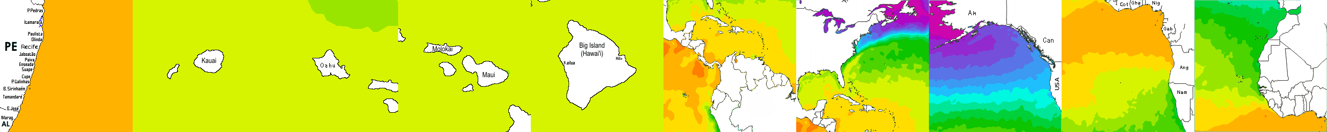 * Temperatura da superfície do mar perto da costa. Diferenças podem ocorrer dentro das baías e perto da foz dos rios, devido à influência das águas costeiras.