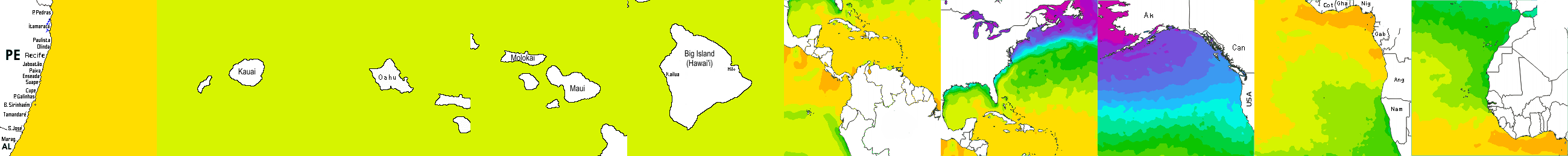 * Temperatura da superfície do mar perto da costa. Diferenças podem ocorrer dentro das baías e perto da foz dos rios, devido à influência das águas costeiras.