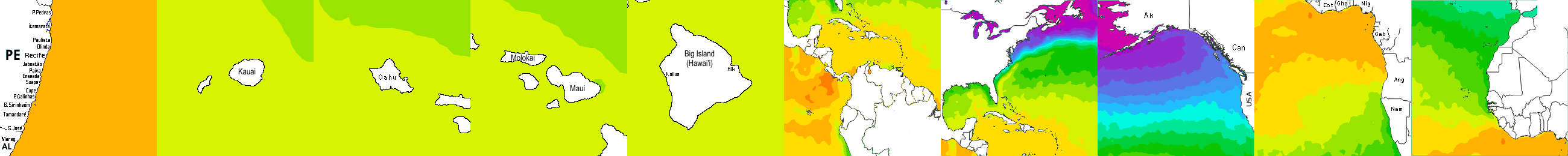 * Temperatura da superfície do mar perto da costa. Diferenças podem ocorrer dentro das baías e perto da foz dos rios, devido à influência das águas costeiras.