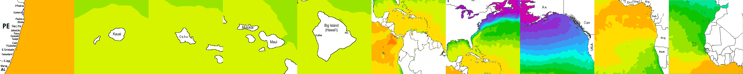 * Temperatura da superfície do mar perto da costa. Diferenças podem ocorrer dentro das baías e perto da foz dos rios, devido à influência das águas costeiras.