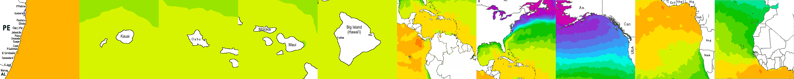 * Temperatura da superfície do mar perto da costa. Diferenças podem ocorrer dentro das baías e perto da foz dos rios, devido à influência das águas costeiras.