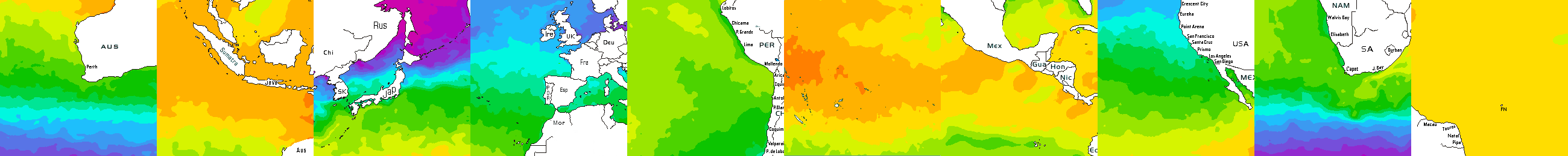 * Temperatura da superfície do mar perto da costa. Diferenças podem ocorrer dentro das baías e perto da foz dos rios, devido à influência das águas costeiras.
