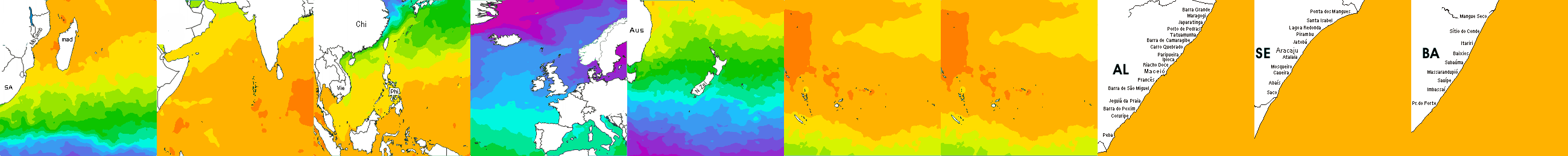* Temperatura da superfície do mar perto da costa. Diferenças podem ocorrer dentro das baías e perto da foz dos rios, devido à influência das águas costeiras.