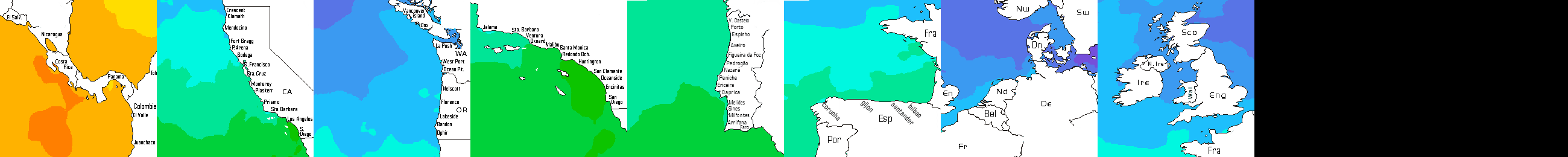 * Temperatura da superfície do mar perto da costa. Diferenças podem ocorrer dentro das baías e perto da foz dos rios, devido à influência das águas costeiras.